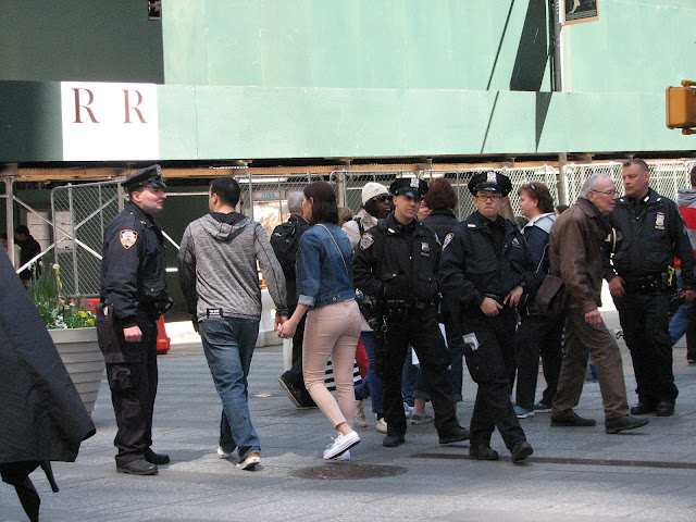 Policias neoyorquinos , de servicio en Times Square , Manhattan , Nueva York . Los turistas se sienten cómodos y confiados sobre la seguridad al ver la presencia policial , quienes siempre estan prestos a brindar información y ayudar a todos , sin distinción de nacionalidad , estatus social , color de piel , raza , ni religión . ¿ Merecen aplausos y ovaciones ? ...... !! Claro que si !! .